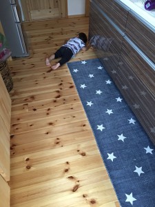 お菓子を食べながら眠気に負けてキッチン横で寝る息子。